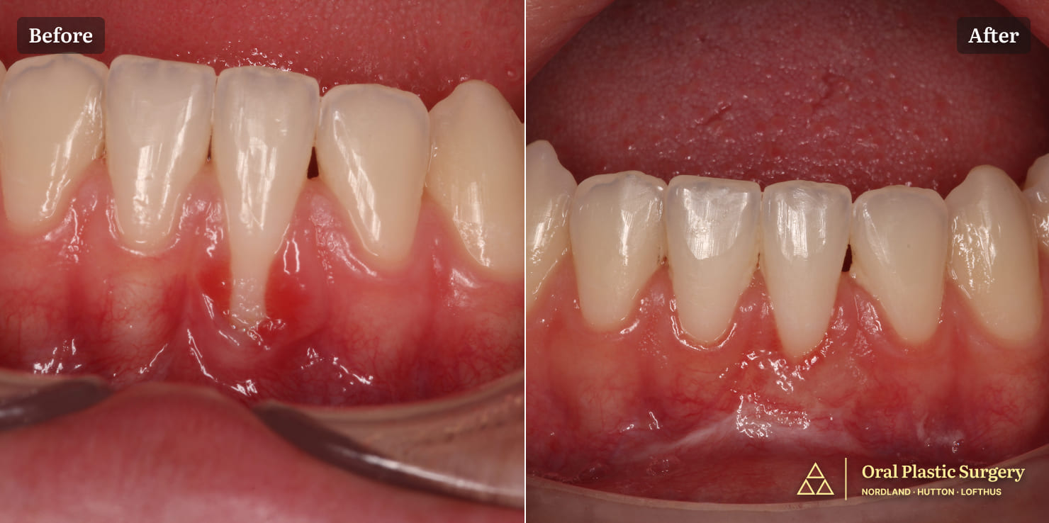 After microsurgical grafting: Healthy gum tissue now covers the root, restoring protection and comfort.