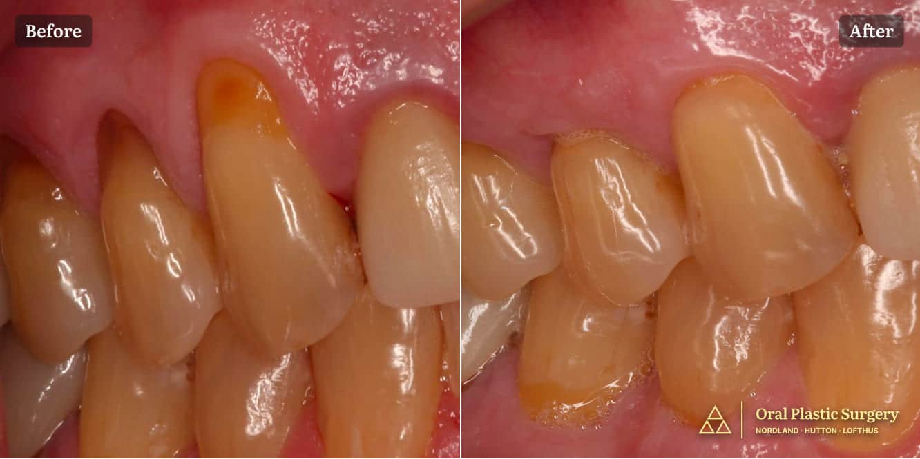 The before image shows recession affecting multiple teeth in the left quadrant, with visible root exposure The after image shows post-operative outcome demonstrating successful root coverage and increased width of keratinized tissue